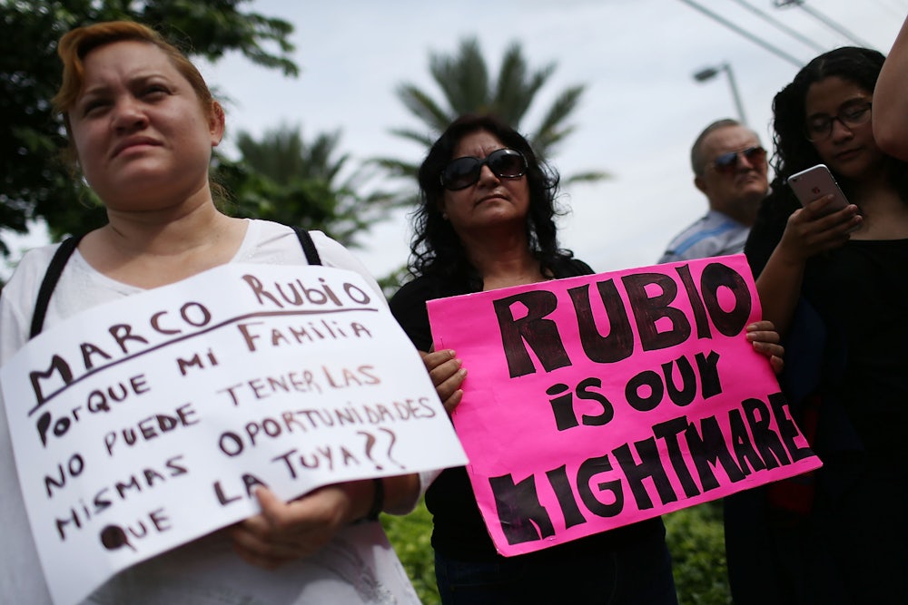 But there’s still Marco Rubio who, in the middle of a spat with Ted Cruz at last Thursday’s debate, outlined his policy position very clearly: registration, fines, heightened border security, lots of waiting, legal status, and then after some more waiting, the possibility of citizenship.