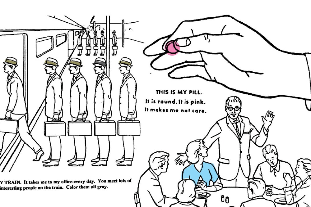 The first adult coloring book, published in late 1961, mocked the conformism that dominated the post-war corporate workplace. Created by three admen in Chicago, the Executive Coloring Book show pictures of a businessman going through each stage in his day, as though teaching a child what daddy does at work. But the captions, which give instructions on how to color the image, are uniformly desolate. “This is my suit. Color it gray or I will lose my job,” reads a caption next to a picture of a man getting dressed for work. Another page shows men in bowler hats boarding their commuter train. “This is my train,” it reads. “It takes me to my office every day. You meet lots of interesting people on the train. Color them all gray.” The rare appearance of a non-gray color is even more disturbing: “This is my pill. It is round. It is pink. It makes me not care.”