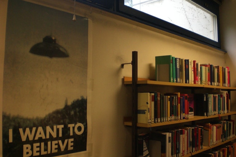 Seven years ago, while doing publicity for the movie we won’t talk about, X-Files creator Chris Carter told Smithsonian.com that the look of the poster “came from me saying, ‘Let’s get a picture of a spaceship and put–Ed Ruscha-like—“I want to believe.”’” A bonus bit of insider info for copyright infringement nerds: Carter also said that no one got clearance for the UFO photo, which had been taken in Europe by a man named Billy Meier. Years after the show’s debut, this oversight caught up with him in the form of an intellectual property lawsuit. In response, a new poster appeared in the show in its fourth season, with a slightly different photo of a flatter UFO.