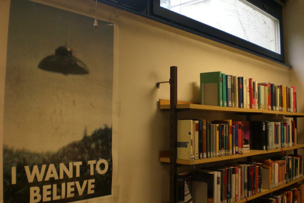 Within the world of the show, the origin story of the “I Want to Believe” poster is that Mulder bought it from a head shop on M Street in Washington, D.C. The poster is ever present in the pitiful basement office to which the supernaturally focused X-Files are assigned. It makes its first appearance in the pilot, and lasts the whole nine seasons. The poster also appears in the 1998 X-Files movie, Fight the Future, as well as the horrendous abomination that was the 2008 movie, cruelly also titled I Want to Believe. I want to believe that this movie was never made. But there’s no need to talk about that.