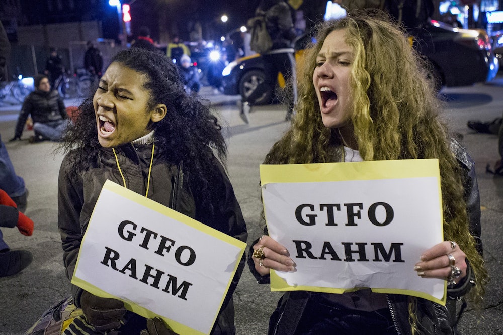 Protesters gathered outside Chicago mayor Rahm Emanuel’s home Tuesday to call for his resignation in the wake of another high-profile police shooting, and an Emanuel aide was reportedly “roughed up” at a prayer vigil Sunday.