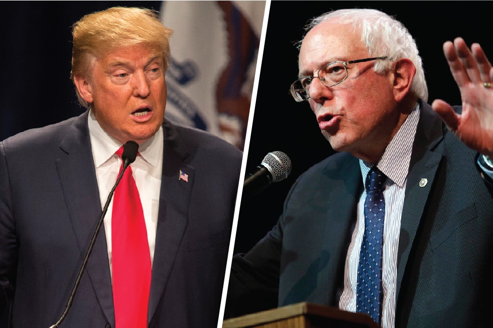 Both speak in terms of decline, especially the decline of the American middle class, of workers and everyday sorts who have seen their status and stability dip over the past decades. “Here is the reality of the American economy,” Sanders wrote in a June 2015 Boston Globe op-ed, “Despite an explosion in technology and a huge increase in worker productivity, the middle class continues its 40-year decline. ... Meanwhile, the wealthiest people and the largest corporations are doing phenomenally well.” And here’s Trump, for comparison, at an August rally: “The hedge-fund guys are getting away with murder. ... They’re making a tremendous amount of money. They have to pay tax. I want to lower the rates for the middle class. ... They’re getting absolutely destroyed.”