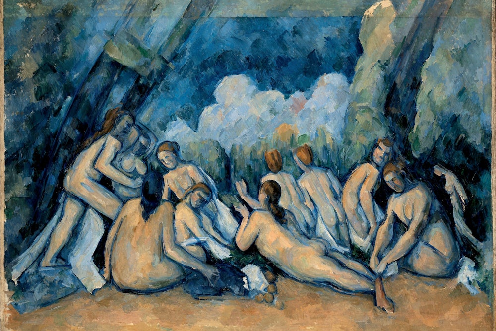 There is an obvious opposition between the character of Cézanne’s work and the man’s character, but there is no contradiction. A genuinely creative artist sees the world not as he is taught to see it, but freshly, in the light of his own needs. Cézanne, tormented, agitated, a prey to endless fears, with nothing in the world around him to sustain him, created for himself the thing he needed. Not, of course, the whole of it, for his ideal far outstripped his powers. His longing went out to a world not only solidly but joyously and conqueringly alive. Many of his early works show the spirit of the romantic illustrator, and this temper never left him. Unfortunately he had no freedom of imagination. He could not work without a model sitting with endless patience. Even if he had wished to post a nude—and the female nude he could not use because of his pathological pudicity—no model possibly could stand as Cézanne required. His romantic compositions were therefore replaced occasionally by the groups of nudes called bathers, for which he utilized the studies made in his academy days, but in the main he painted instead the apples and landscapes and rare persons that were sufficiently amenable to his requirements. As flowers did not last until a picture could be finished, he used paper flowers instead, and these had sometimes faded almost white before the picture had reached completion. In fact, it very rarely happened that a picture was to his mind completed. Existence, and more existence, was almost an obsession with him. There were some canvases on which he worked for several decades.