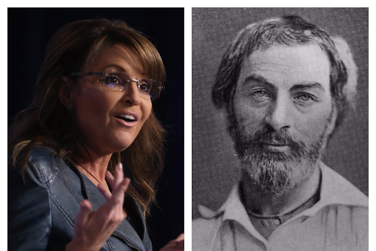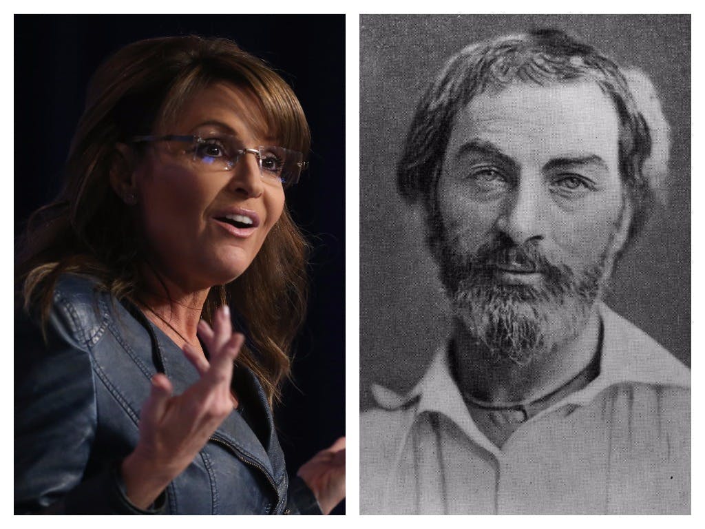 Now that Palin is back in the spotlight, it’s hard not to hear her voice in her great precursor Whitman. Palin’s alliterative apostrophe to the common folk of Iowa (“You farm families! And teachers! And teamsters! And cops, and cooks!”) calls to mind the egalitarian inclusiveness of Whitman’s many lists, as here from “I Sing the Body Electric”: