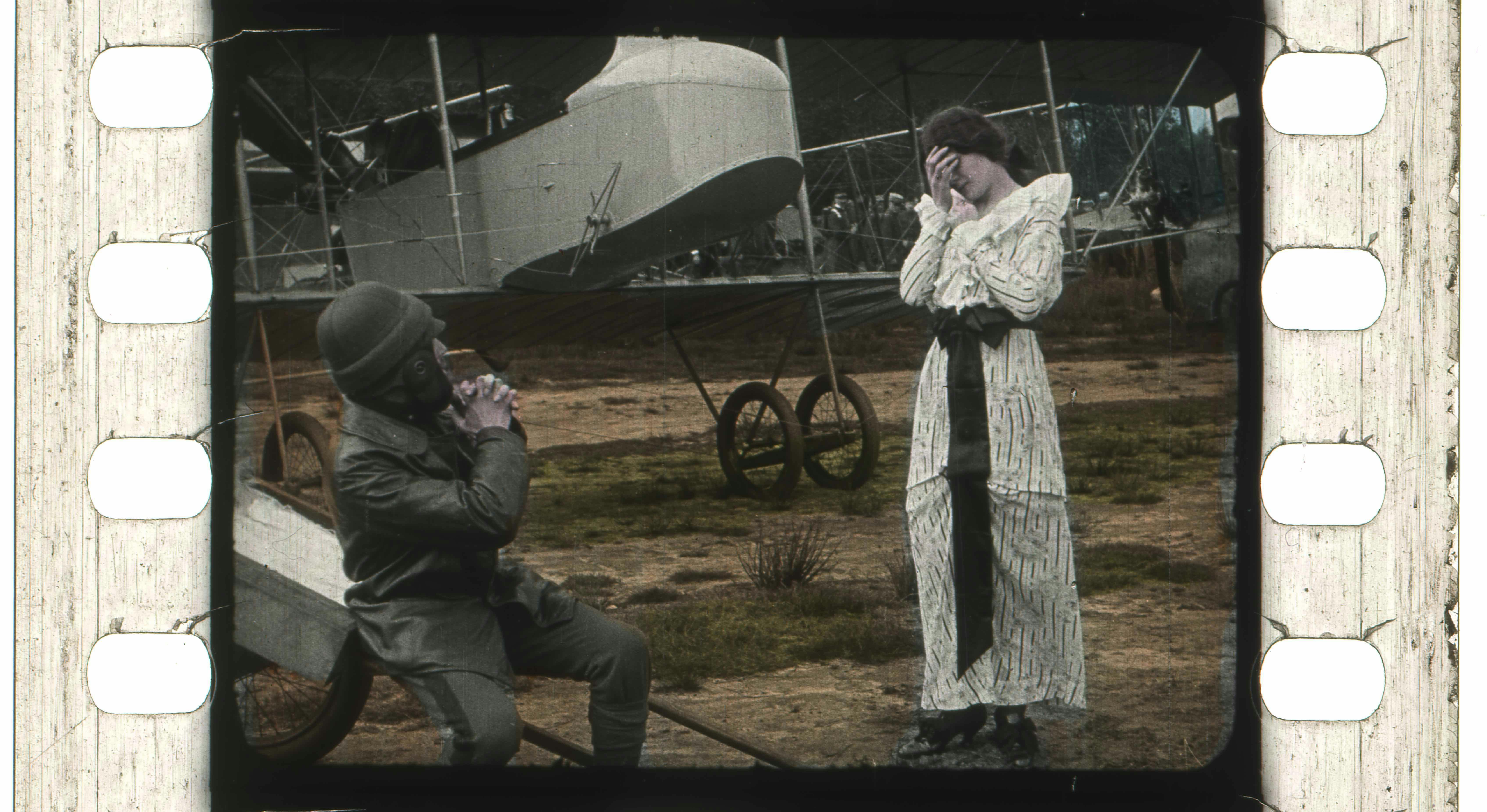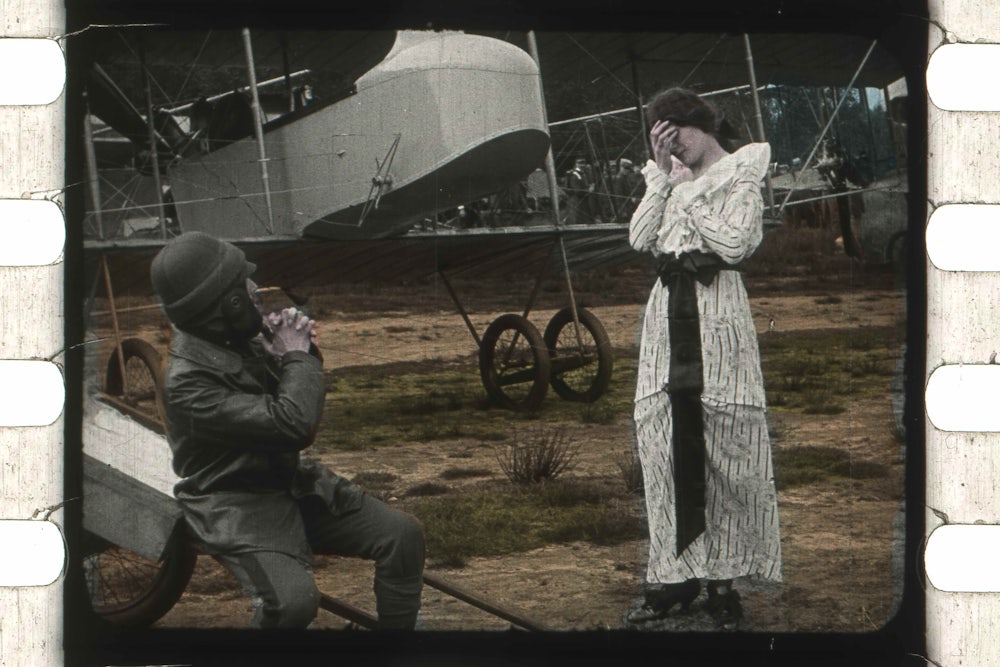 If the stills collected in Fantasia of Color, many of which come from Edison and Pathé films preserved in Amsterdam’s EYE Film Institute, don’t give a sense of this hovering effect, they suggest much about the sheer, uncanny strangeness color conferred on early films. They produced especially ghoulish effects when applied to fairy tale movies or films documenting magicians’ tricks. (In a still from a 1903 Pathé adaptation of Puss in Boots, a king flinches at the static presence, near the rightmost edge of the frame, of a bright red bear standing rigidly on its hind legs.) And yet, like breakthroughs in studio architecture, breakthroughs in color affected movies both conventionally “realistic” and outwardly fantastical. Whimsical illusions of the sort associated with Méliès and Chomón were hand-colored, but so, the book shows, were travelogues set in the Swiss alps, local actuality films like Gaumont’s Dutch Types (1914) and antiwar propaganda efforts like Maudite soit la guerre (1914). In a frame from Pathé’s 1911 restaging of the infant Moses’s discovery in the Nile, a princess’s attendants walk in a double-file procession sheathed in pale, purple gossamer dresses. It’s another poignant aspect of Fantasia of Color that, as more than one of the book’s contributors stress, the colors it reproduces are particularly difficult to preserve. To keep them this vivid involved efforts as strenuous and fine-grained as the work it took to color them in the first place.