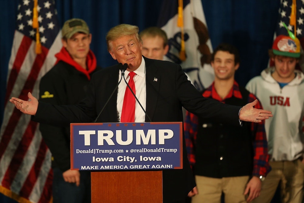 During a campaign stop at the University of Iowa last night, Trump invited several members of the school’s football and wrestling teams up on stage with him in a show of masculine bravado. It was a shrewd political move in Iowa, a state that takes football and wrestling very seriously, but it may have violated the NCAA’s bylaws.