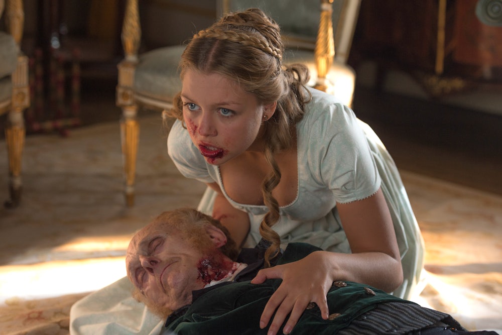 At first, the image of Elizabeth and the other Bennet sisters (played by, among others, Bella Heathcote and Ellie Bamber) pulling long blades from their stockings to impale zombies is an arresting, cheekily fetching sight. But if you’ve seen one sequence of beautiful lasses dispatching zombies, you’ve seen them all, and the movie’s mixture of high and low culture—sticking Austen’s demure characters into the same pop-culture blender as schlocky horror thrills—starts off funny but proceeds to get awfully familiar quickly.