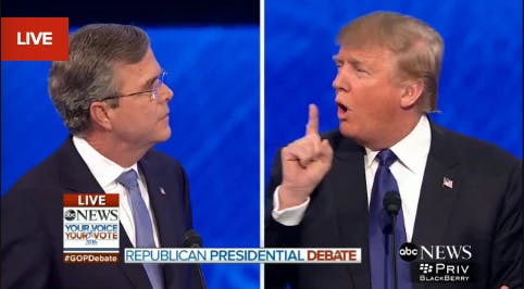 Like a true heel, Trump attacked the audience at the ABC debate, claiming it was packed with Republican hacks. (For those who are clueless about the WWE, a heel is the bad guy who is rude and crude and breaks the rules, who is mean to children and puppies, etc., and who many fans root for anyway.) After giving a surprisingly fluent defense of eminent domain, Trump mocked Jeb Bush for criticizing him: “He wants to be a tough guy.” Then he shushed Bush (“Quiet.”), and the audience booed. And here was Trump’s best performance as a heel since the first debate. “That’s all of his donors and special interests out there,” Trump said, waving his finger at the crowd. They booed more. “That’s what it is,” he shrugged.