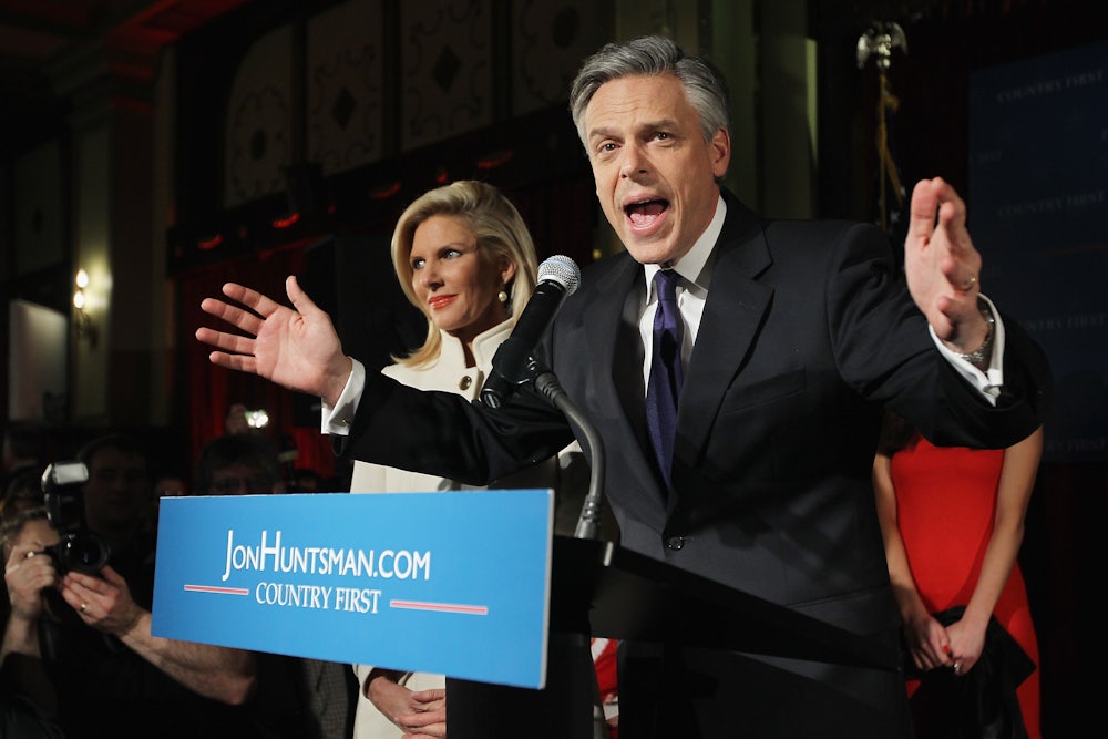 Set aside, if you can, the hilarity of a Mandarin-speaking former member of the Obama administration running in a Republican primary. Huntsman had staked his entire campaign on the Granite State, and his performance—netting 17 percent of the vote—was deemed so poor that he bowed out of the race days later. Ron Paul, who won 23 percent of the vote, came in second. Mitt Romney’s victory, with 40 percent of the vote, was considered so crushing that Politico wrote he was using it to “send a signal to the party that it’s time to start uniting behind him.”