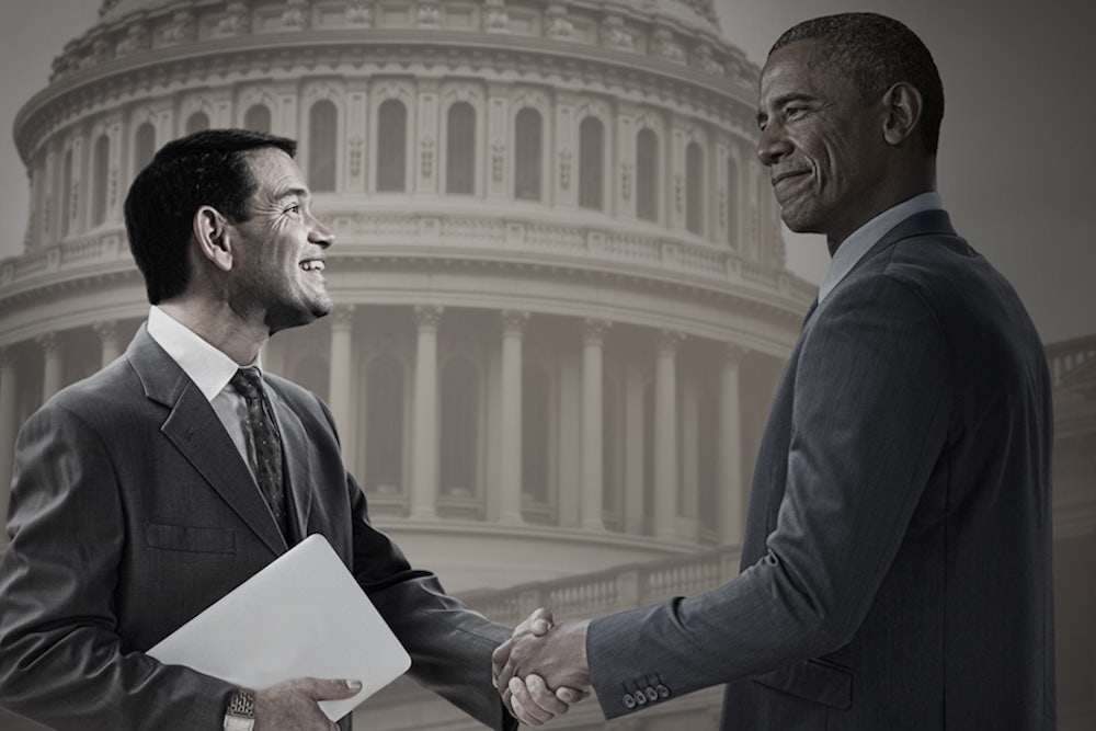 As CNN pointed out this afternoon, the photo was ‘shopped using a generic stock image from Getty and cutouts of Rubio and Obama’s faces. Cruz’s campaign managed to at least get some details right—Obama’s head was placed atop a black man’s body, which is a bigger victory than you might think—but their heads are weirdly proportioned.