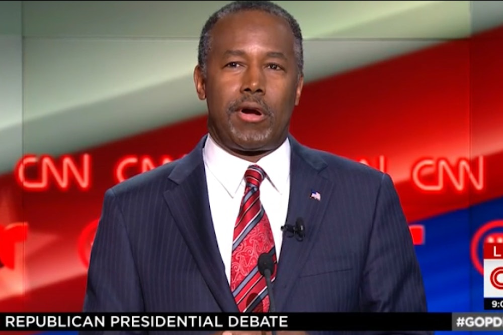 Carson has not spoken much during tonight’s debate, sequestered as he is at the end of the stage. But he’s made the most of what little time he’s had.