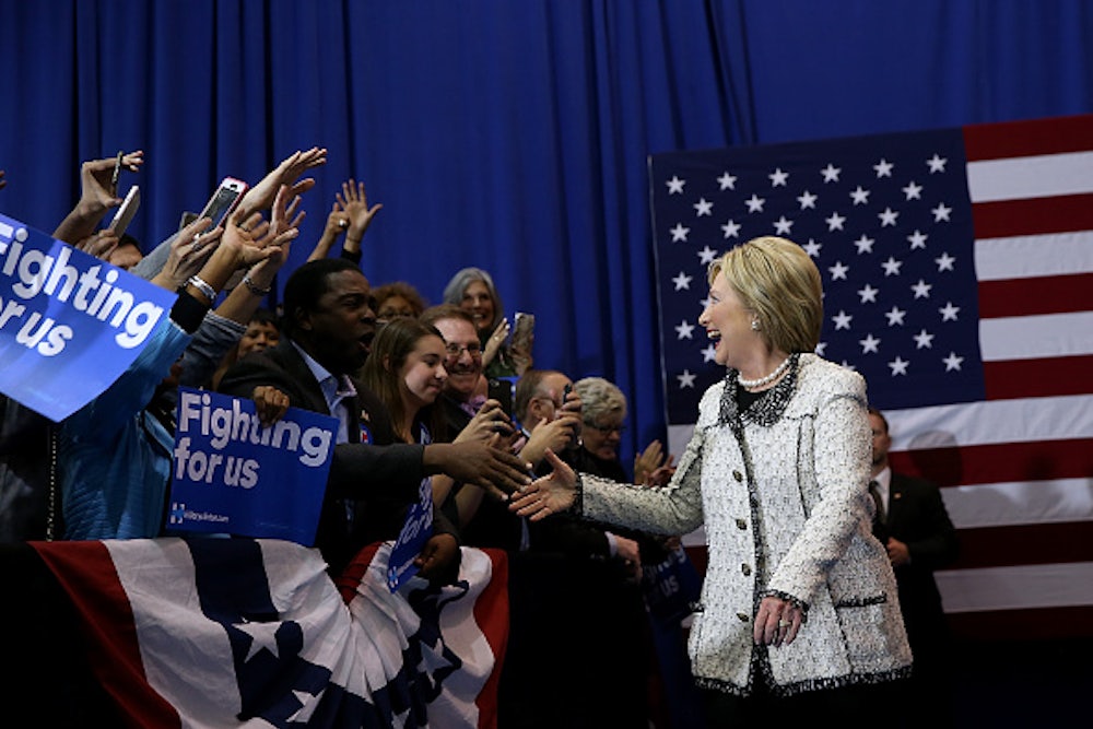 After her huge victory over Bernie Sanders in the South Carolina primary on Saturday night, Clinton declared, “We don’t ever need make America great again—America is already great!” It was just this week that the whole world woke up to the terrifying realization that not only is Donald Trump likely to win the Republican nomination for president, he could actually get elected. But Clinton appeared to welcome a matchup against Trump, pitching herself has his opposite, all her empathy and kindness against his macho swagger.