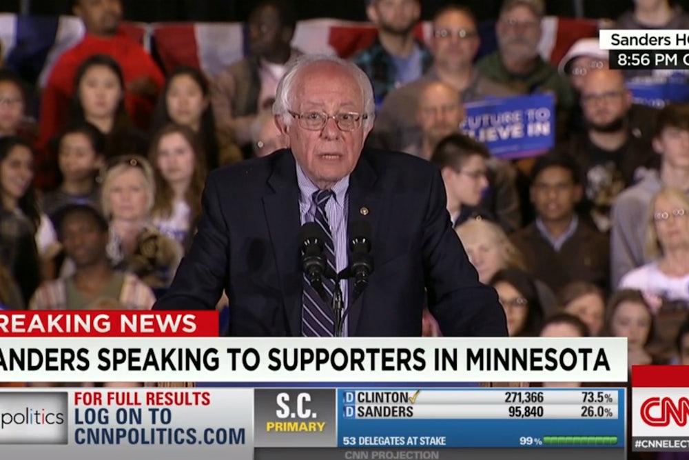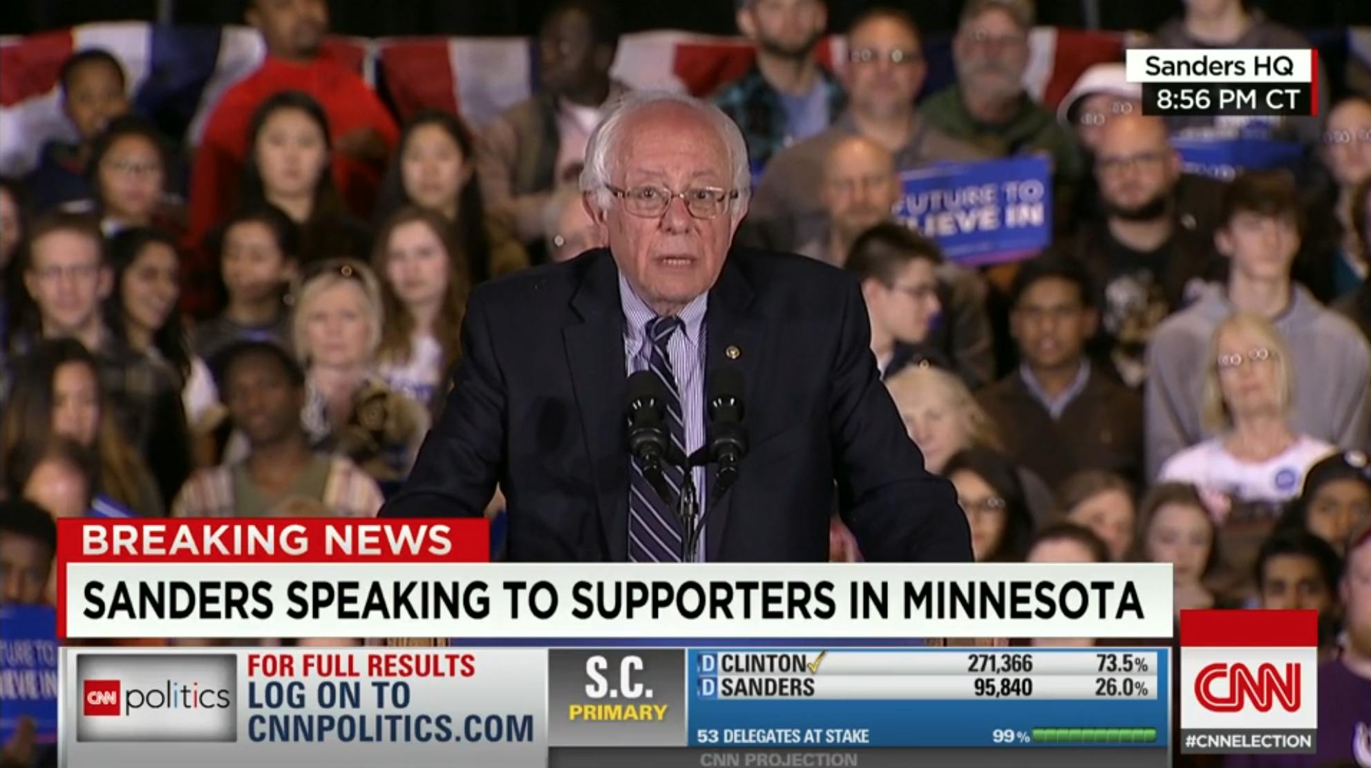 The Sanders campaign was en route to Rochester in Super Tuesday state Minnesota when the networks all called tonight’s South Carolina primary for Hillary Clinton. CNN reported that Sanders called Clinton to congratulate her even before the polls closed, and long after Clinton delivered her rousing victory speech, Sanders took the stage, not to deliver a concession, but hold a campaign rally.