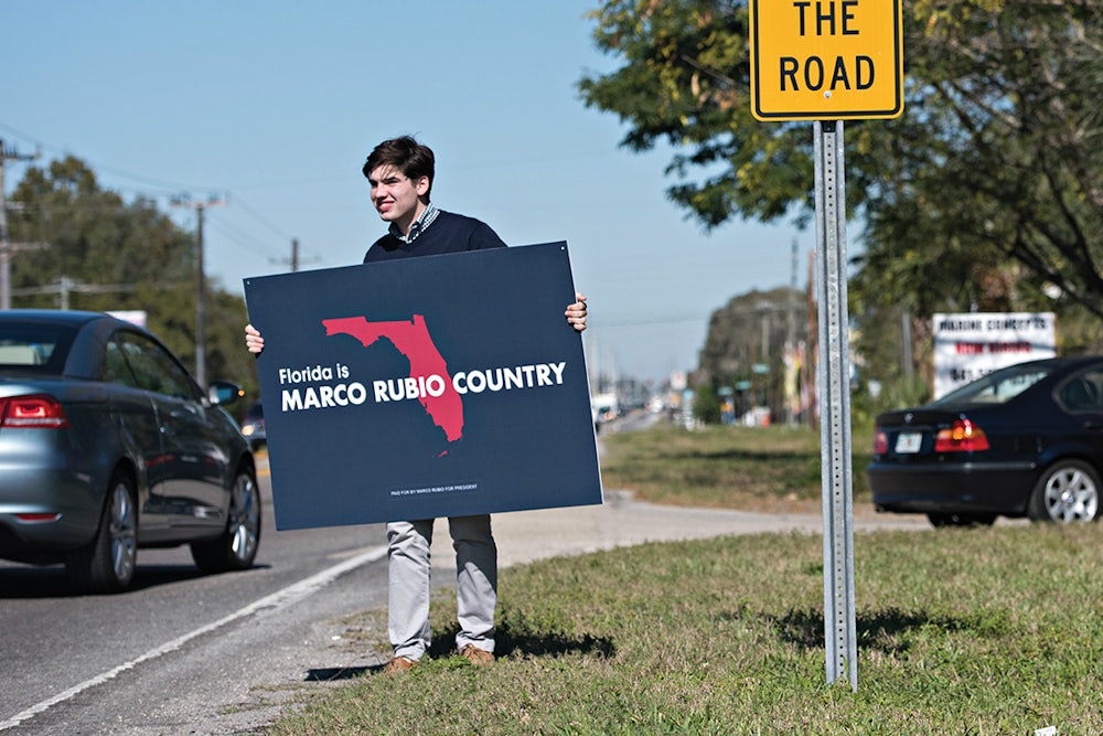 I stopped at a gas station near Indiantown. A middle-aged white man with a mustache standing near his pickup truck told me Rubio was the only candidate who made sense to him because of immigration. “Rubio would put them to work, legalize them. The work around here isn’t the kind that Americans are willing to do. Trump’s talking nonsense. If he rounded up these people and sent them back home, who would do the work?” The “work” he referred to is how the oranges and tomatoes traveling along 70 ended up packaged on the shelves of Wal-Mart and Whole Foods; Florida has the country’s third-largest concentration of illegal immigrants, and a majority are undocumented workers of Mexican, Haitian, and Colombian origins. Some of these immigrants work for as little as $5 an hour, and are often subject to working conditions that have been likened to modern-day slavery, including physical beatings and sexual harassment.