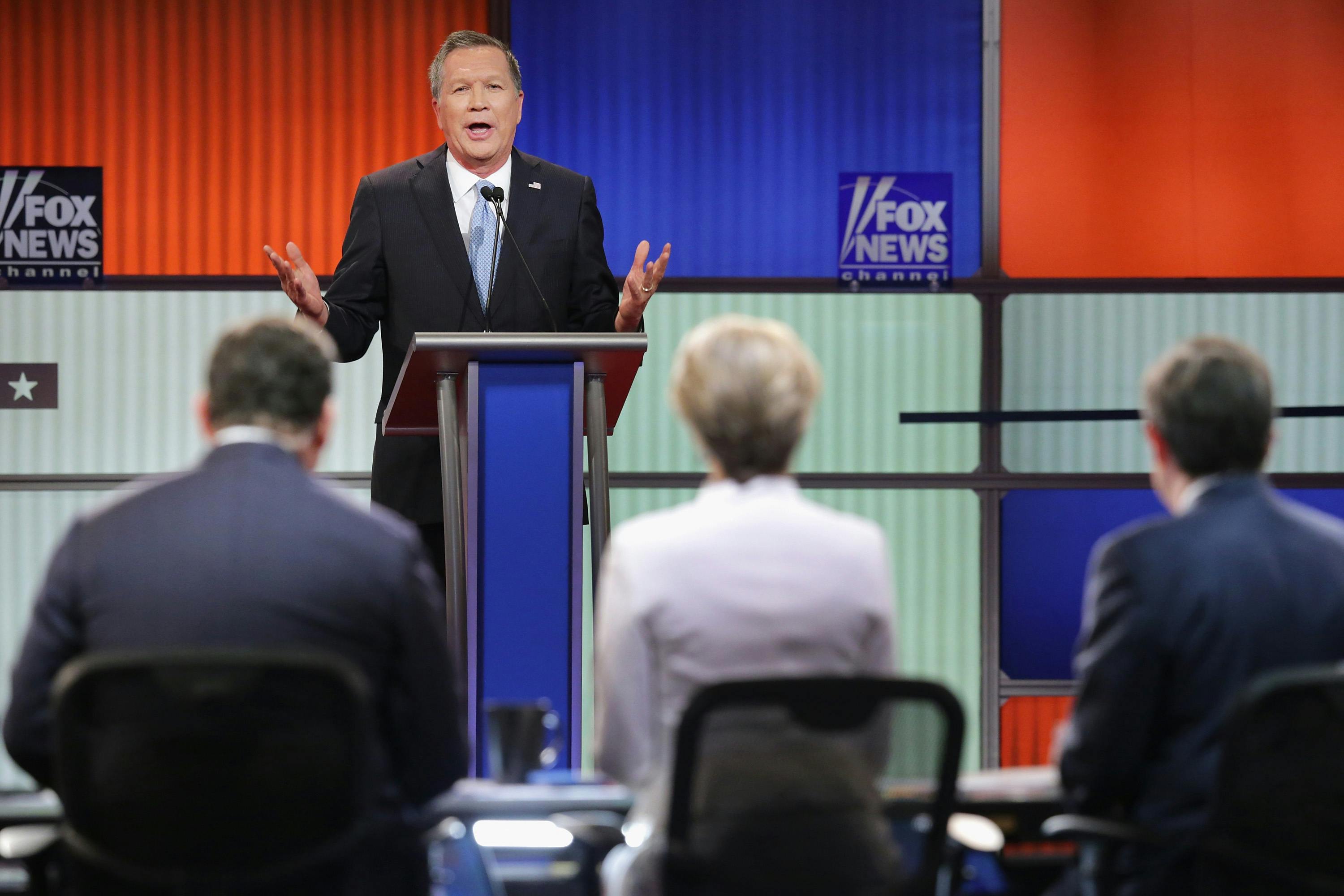 Kasich had a tough time with this one. He stuttered a bit, and hedged, and said, “I believe in traditional marriage, between man and a woman.” But then he put on his Prince of Light and Hope crown and said that we should respect everyone’s difference and love one another, no matter what their beliefs are. In tonight’s debate, Kasich presented an inversion of his usual argument: he implied that gay couples should learn to love the people who hate and discriminate against them. It was still better than what Ted Cruz said when he was asked about religious liberty.