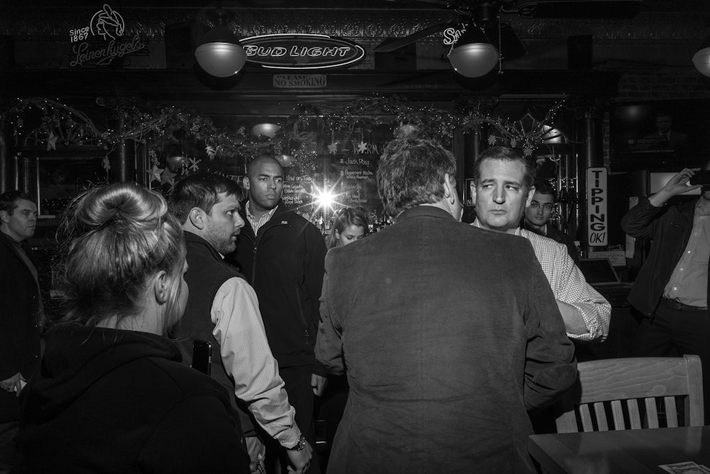 When people ask me about Ted Cruz, I tell them at first I didn’t like him at all, but as I’ve gotten to know him better, I find myself constantly vacillating. While following him in Iowa, my wife and I had identified a tick of Cruz’s—when we saw him in person, especially when there were few or no TV cameras around, he followed a routine when he spoke. He made a point he felt passionate about while poking his finger. Then he nodded sternly, making eye contact with people in the room. Then he smiled, and then he looked at a new member of the crowd, and he laughed. Cruz has an unusual and kind of endearing laugh. He pokes his teeth out and sort of seems to retract his neck into his chest like a frightened turtle. His head bounces a little, almost imperceptibly, and then he puts the teeth away.