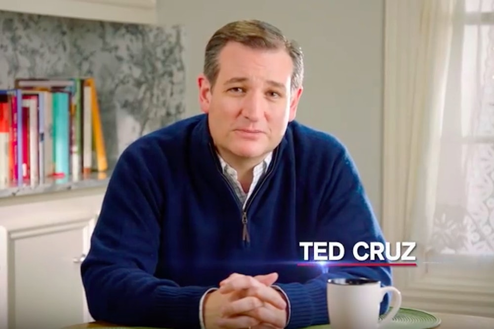 Ted Cruz is sitting at your kitchen table. There are pink books stacked neatly on the shelf behind him. Delicate lace curtains hang from the windows. “Wisconsin is a beautiful place,” the Texas senator says, in a voice huskier than his trademark nasal whine. “Our campaign is for the working moms, the truck drivers, the mechanics and machinists with callouses on their hands.” The music swells. This fellow is going to repeal Obamacare! Peel back the EPA and all those burdensome regulations holding back the working moms and calloused mechanics! The camera cuts out. Cruz saunters through a smoky field at twilight, a rifle thrown over his shoulder.