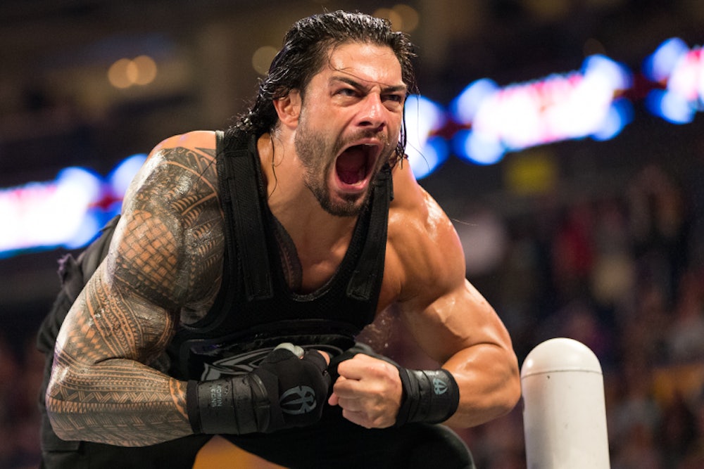 Reigns checks all the boxes for a WWE star 2016. He’s a former Division I athlete and member of a legendary Samoan wrestling family tree that includes Yokozuna and The Rock. Reigns is big, objectively handsome, emotes effectively, has no backstage drawbacks (no drama, no substance habits) and even sports a chic shoulder-sleeve combo tattoo ripe for merchandise and for cosplay. His first two years in the WWE were spent as part of a three-man-team known as The Shield, a sort of SEAL Team Six of the up-and-coming elect (in the Calvinist sense). There, Reigns, flanked by two young acclaimed independent wrestlers—Seth Rollins and Dean Ambrose—who did the lion’s share of the in-ring and the microphone work, simply had to look cool and pretend to punch people.