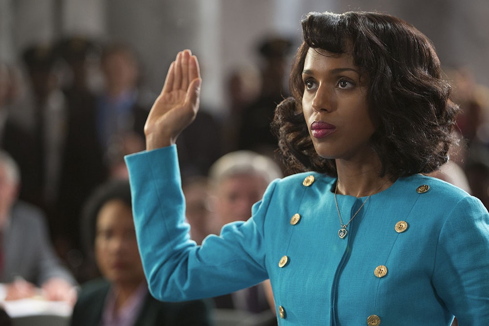 Anita Hill was a 35-year-old Oklahoma law professor who reluctantly became a household name in October 1991. As Hill, Kerry Washington quickly erases any lingering thoughts of savvy, theatrical Olivia Pope from Scandal. (In a strange coincidence, the real-life inspiration for Pope, Washington fixer Judy Smith, was deputy White House press secretary at the time, and she is played in the film by actress Kristen Ariza.) Washington’s Anita Hill is judicious, every word she says carefully considered. She speaks slowly, with long pauses; slouching forward, she walks like someone who wishes no one were looking at her. Asked on the phone by a Senate investigator if working at the Education Department and the EEOC with Thomas were good experiences, she answers deliberately, “I was proud of things we accomplished.” When she puts on what would become her iconic teal dress, the camera lingers as she stands in front of the mirror, fastening the oversized buttons. In that moment, the linen skirt-suit looks like body armor.