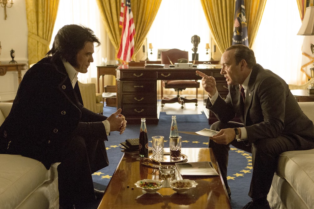 There’s a dull, pointless subplot at the movie’s center about whether or not Jerry Schilling (Alex Pettyfer), a former Elvis aide who now works in Hollywood, will go back to working for Elvis or go meet his girlfriend’s parents for dinner back in California, a plot that’s takes up far too much of the movie and is ultimately dropped without much fuss. The key to the movie is how well we see these two men, these iconic figures captured in that one insane photo. Nixon is more of a cipher; he’s mostly just Generic President, played by Kevin Spacey as a slightly out of touch old man, who can’t quite grasp how deranged Elvis has become but briefly sees a kindred spirit—another guy, like him, who came from nothing to the top of his field, the original Started At The Bottom Now He’s Here. It’s mostly an impersonation by Spacey, which is an odd direction to take. Spacey has such a specific presence now—solidified by his role as a president, of all things—that you expect him to bring more to the part than he does. But he seems happy simply doing a Nixon impression and moving on. It’s sort of a bummer.