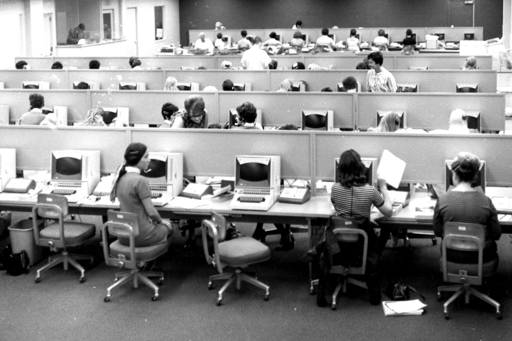 Evelyn Berezin pitched her Ms. ad to women in the workplace, but Berry’s praise for the wife who can out-process Microsoft Word shows that the literary history of word processing is also gendered in a way that is perhaps beyond the historian’s reach. There can be no true distinction drawn between the effect of word processing on the literary imagination and its intervention in the working lives of the women employed as noncreative automata. The data are skewed. Women typists are visible in the historical record when they are working for money in an office environment, but invisible almost everywhere else—slipping between categories, in and out of the credits. How can we know who was working where, what relationship each female amanuensis had with each new device that came to take her work away? Kirschenbaum’s book proves that women can take their place among the mechanical objects that produced the last century’s great works, and he records their lives and thoughts as far as he can. By the same token, however, he demonstrates that Updike’s frustrations with word processing were only about himself, and were therefore a fraction of the true story.