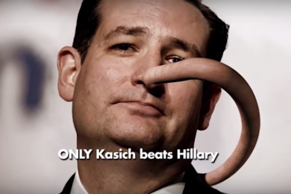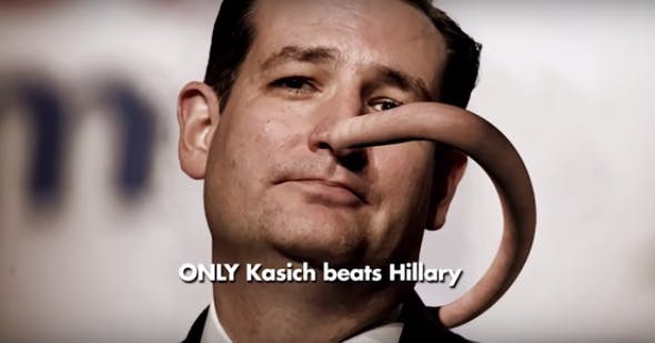 This ad, also made by Fred Davis for Kasich’s New Day for America PAC, seemed to repulse the entire Twittersphere. “Super gross,” wrote Katie Couric. “Wurst ad this cycle,” Politico quipped. “Nightmare fuel,” The Washington Post’s Chris Cillizza called it. But if the goal was to make Ted Cruz look more unappealing than he already does, it certainly does the trick. The imagery conjures up all kinds of unpleasant connotations: Pinocchio, snakes crawling around your neck, a noose. Can’t you just feel that nose tightening around your neck?