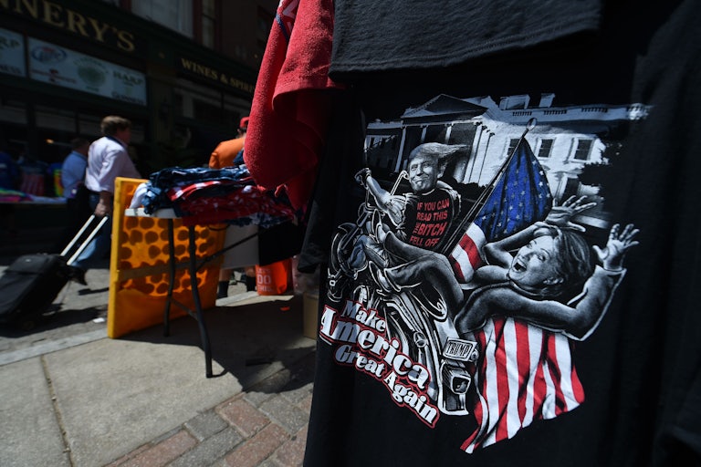 The punitive theme persists on the streets of Cleveland—and inside the convention hall—but now Clinton isn’t simply behind bars or in chains. Many other items are less concerned with her supposed criminality than her gender. I had seen many “Trump That Bitch” shirts before. But this was a new one: Trump riding a motorcycle up the White House driveway as Clinton tumbles off the back of his hog, revealing text on the back of his jacket: “If You Can Read This The Bitch Fell Off.”