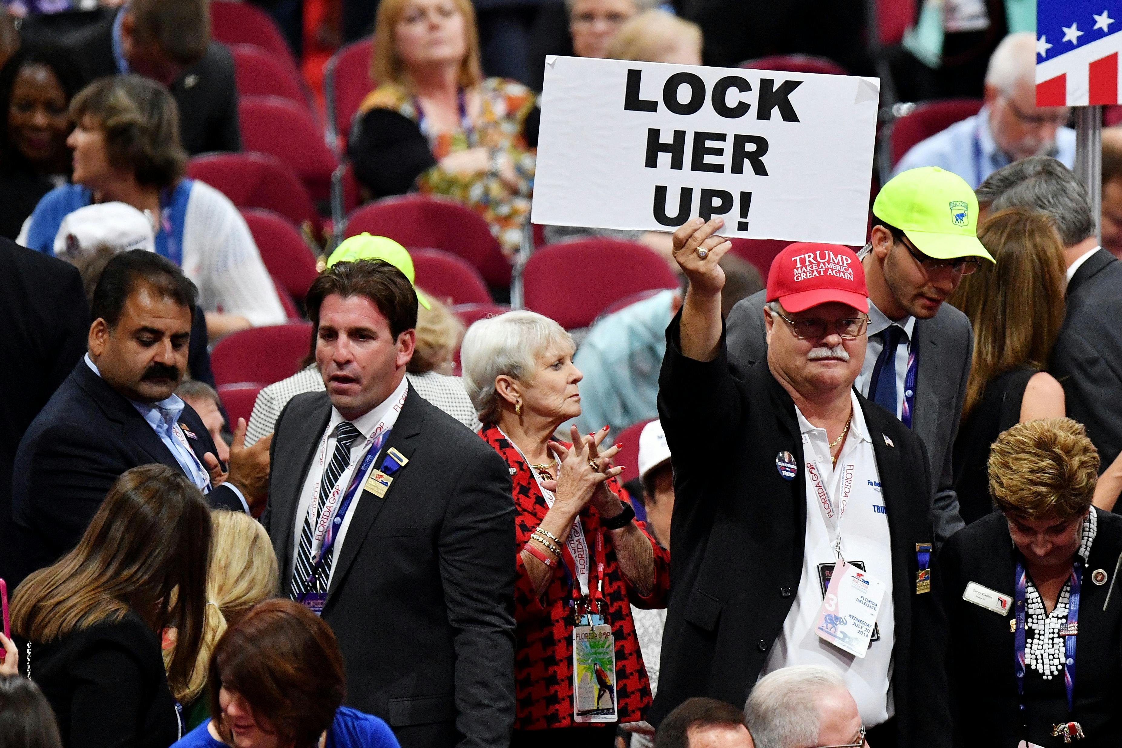 “Lock her up” has replaced “Make America Great Again” as the theme of the RNC convention, in much the same way as “Drill, baby, drill” and “You built that” took over the 2008 and 2012 conventions, respectively. (“Lock her up” is a tad more combative, though there a jackbooted quality to the others, as well.)