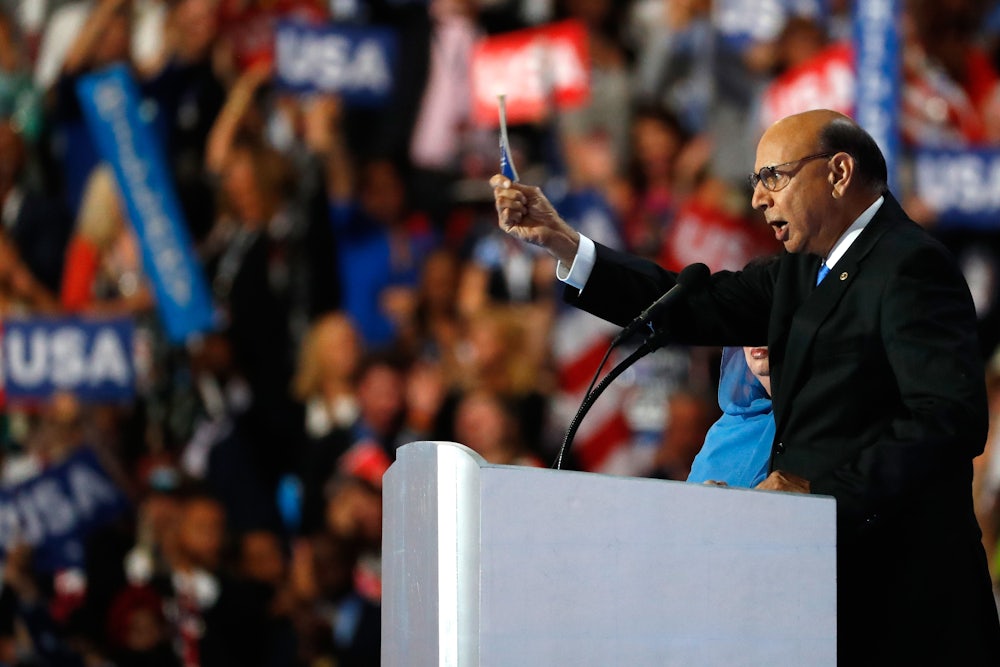 “If it was up to Donald Trump, he never would have been in America,” Khan said. “Donald Trump consistently smears the character of Muslims. He disrespects other minorities, women, judges, even his own party leadership.” Later, drawing a paperback pamphlet from his pocket, he added: “Have you even read the U.S. Constitution? I will gladly lend you my copy.”