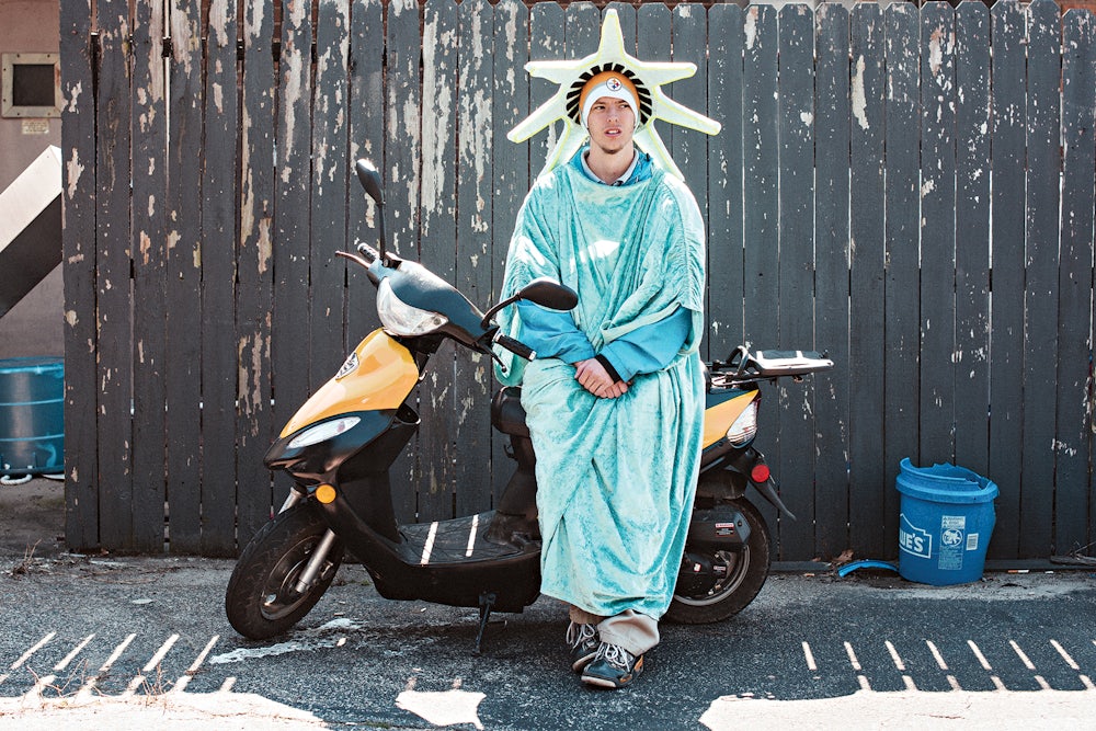 Damien Trott, pictured above, works as a mascot for Liberty Tax Service in Columbia, South Carolina. Standing on the roadside, he fears getting jumped by gang members. Only 21, he was once hospitalized after being attacked. He now spends his workday in a state of constant anxiety. “You never know what might happen,” he says. “Protect yourself at all times.”