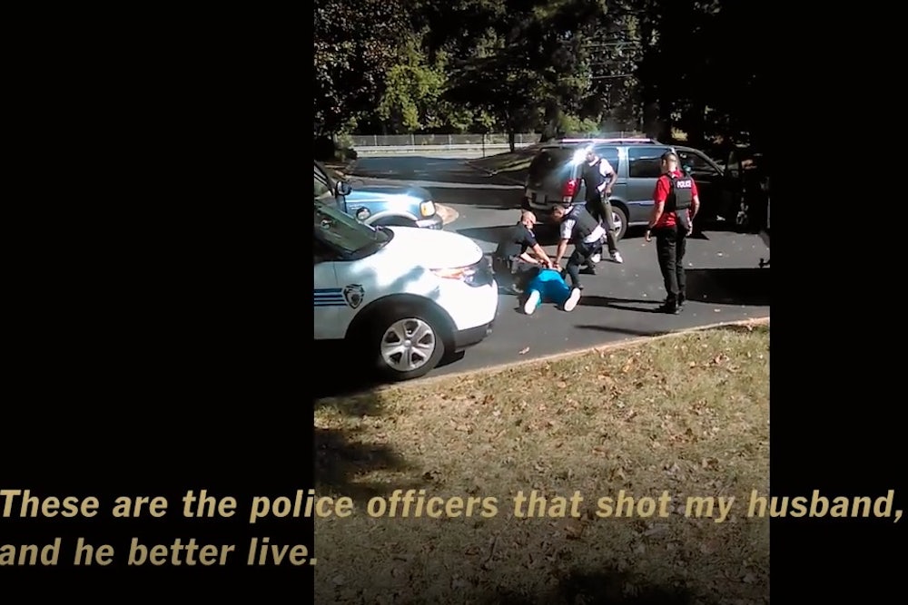 The wife of Keith L. Scott has released a video she took on Tuesday afternoon when police fatally shot her husband. The video doesn’t answer the disputed issue of whether Scott was armed or not, but it does make painfully clear that as the standoff unfolded, Rakeyia Scott was all too aware that the police might unleash lethal force. She repeatedly tells the police not to shoot, and that her husband has a traumatic brain injury. From the New York Times transcripts of what happened immediately before the shooting: