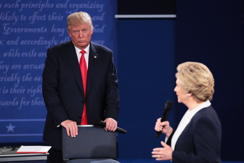 Since Trump can’t respect Clinton as a peer or worthy foe, he has to figure out some way to reframe the battle. So he portrays her as a mere facade of a larger system he’s fighting: “Crooked Hillary,” the face of the corrupt establishment. And he accuses her of cheating—by “rigging” the election in coordination with the media, and by taking performance-enhancing drugs that help her win debates (as Hannah Fearn notes in The Independent, this carries with it the suggestion that as a woman she’s too weak for power without medical aid).