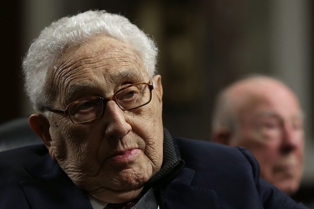 Kissinger stayed largely silent during the election, emerging only to release a joint statement with fellow Republican foreign policy veteran George Shultz that he would not be endorsing a presidential candidate. That statement was a relief for many on the left who feared that Hillary Clinton was courting Kissinger, a longtime friend, in an attempt to woo disaffected Republicans. But if there was a silver lining to the otherwise interminable and horrifying election, it was that Kissinger seemed like a man without a country—too damaging for Clinton and too establishment for Trump, who ran in part by arguing that America’s military was overstretched and that its intervention-heavy foreign policy was foolish. (In keeping with his campaign strategy of throwing as much shit at the wall as possible, Trump also repeatedly contradicted these points by arguing for military intervention in Iraq and Syria.)