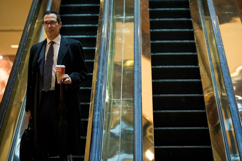 But nine days after his unexpected victory, Trump—and the Republicans in control of Congress—have shown every sign that they plan on unleashing America’s financial institutions. Politico describes Trump’s expected cabinet as an “investment banker’s dream,” with either former Goldman Sachs partner Steven Mnuchin or JPMorgan Chase CEO Jamie Dimon as Treasury secretary, billionaire Wilbur Ross in Commerce, and former Goldman banker Steve Bannon helping to run the show in the West Wing. (Bannon’s history with Goldman, however, is hardly the most troubling thing about him, or his proximity to Trump.) Moreover, Trump has promised to dramatically decrease taxes for the wealthiest Americans and signaled that he will deregulate the financial industry to a nearly unprecedented degree. “You would have to go back to the 1920s to see so much Wall Street influence coming to Washington,” Charles Geisst, a Wall Street historian at Manhattan College, told Politico. And there’s a reason why Wall Street regulation increased after the 1920s!