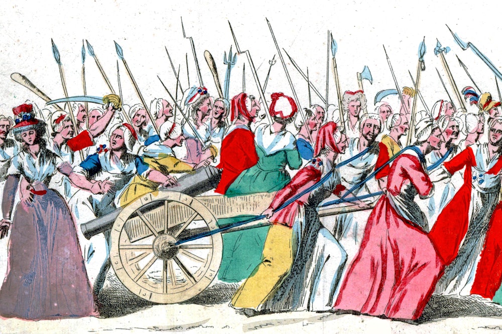 On October 5, 1789, a crowd of more than seven thousand women—fish sellers and bakers, working women from the markets, bourgeois “bonnet-wearing” women from the suburbs—marched the twelve miles from Paris to Versailles to demand King Louis XVI release his stores of grain. The march had been planned at the Palais Royal by a group of women who were furious over food shortages, especially after rumors that the king had thrown a lavish feast for his bodyguards only days before. The women swore that together, they would save the city: “Tomorrow things will be better because we will be in charge!”