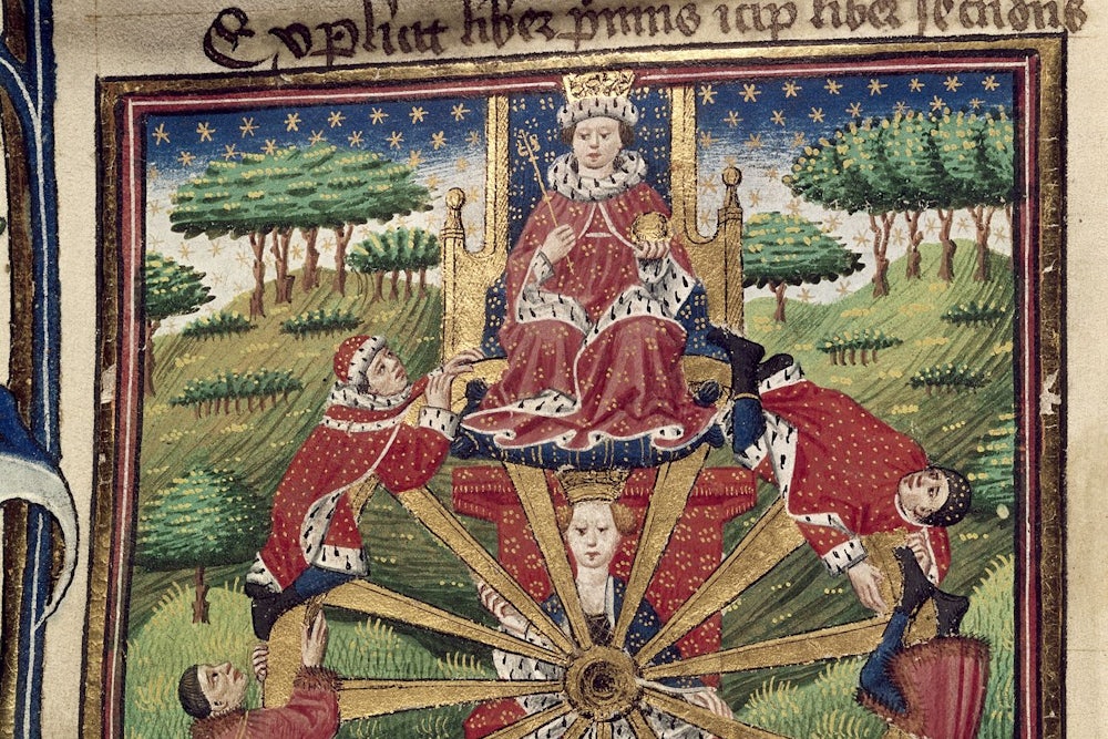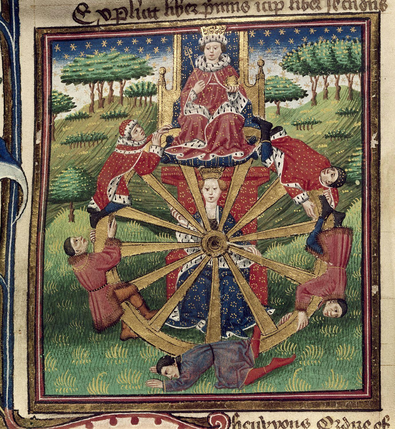 Literary works like Boccaccio’s De casibus virorum illustrium (“the fates of great men”) explore our lust for stories about the big man brought low. The medieval Arthurian tradition has the king experience a vision of the wheel of fortune, in which a capricious figure brings men high and low according to her spins. In that dream, Arthur sees Alexander and eight other great men of history crushed by the wheel. In Hamlet, Shakespeare draws upon this tradition when he cites the “slings and arrows of outrageous fortune.”