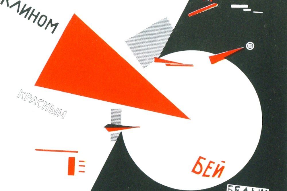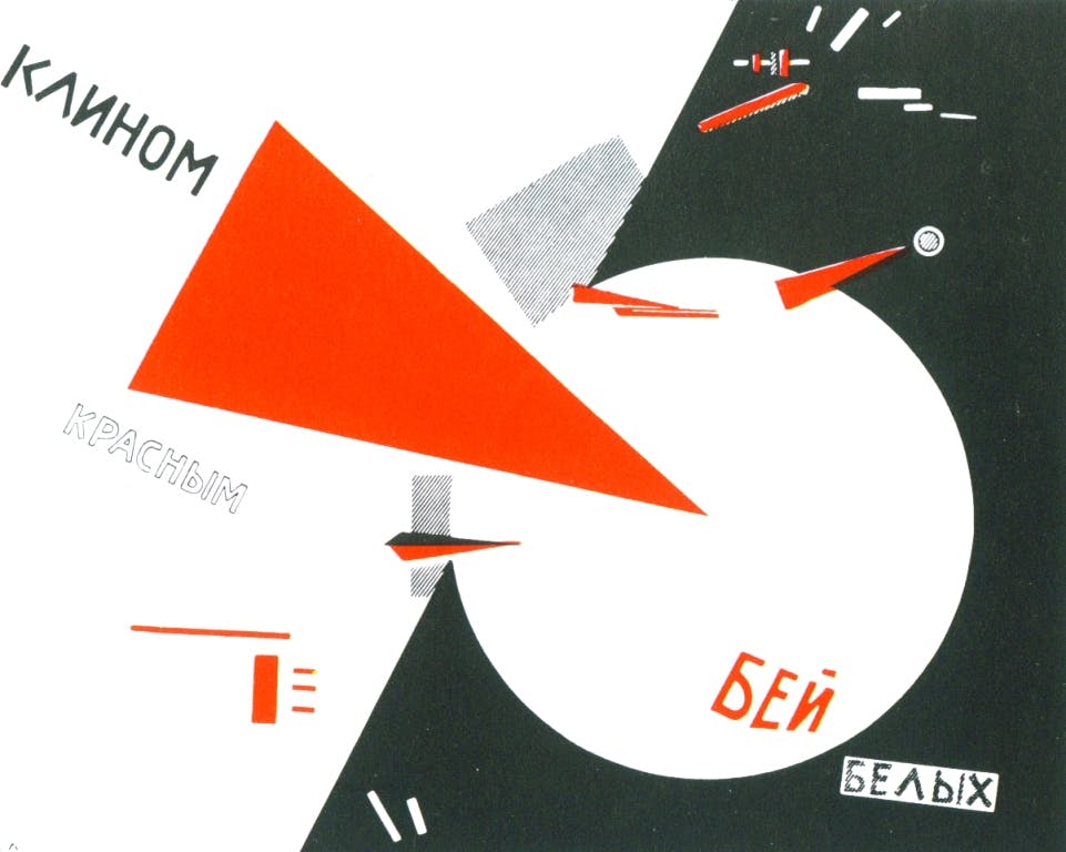 That red triangle in El Lissitzky’s poster? It represents blood. Because the Bolsheviks killed people. “Nauseatingly, we forget that reality when we celebrate El Lissitzky’s poster,” Jones writes, adverbially.