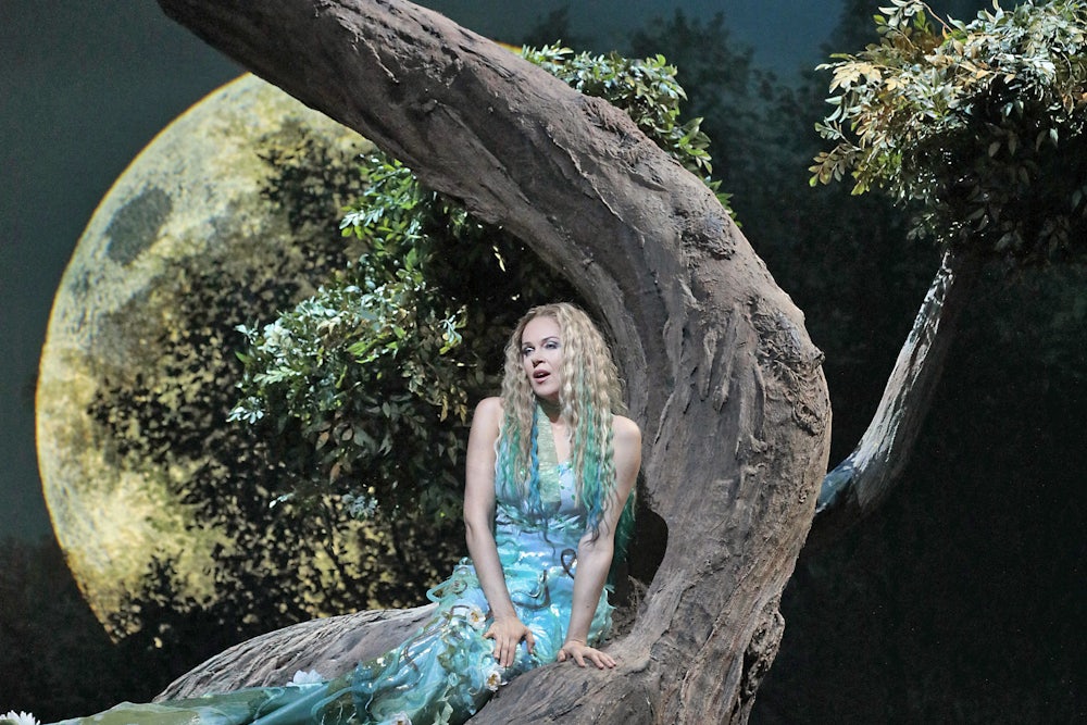 Under the moon, a naiad with blue hair extensions lounges in a willow tree’s crook. Below is her native lake, ringed by trees. According to Slavic tradition, her name is Rusalka, the water sprite. Between us, silver retractable baubles twinkle in the Metropolitan Opera’s ceiling. To my right, a man in black tie sighs. Kristine Opolais is singing the title role in the Met’s production of Rusalka, an opera by Antonín Dvořák.