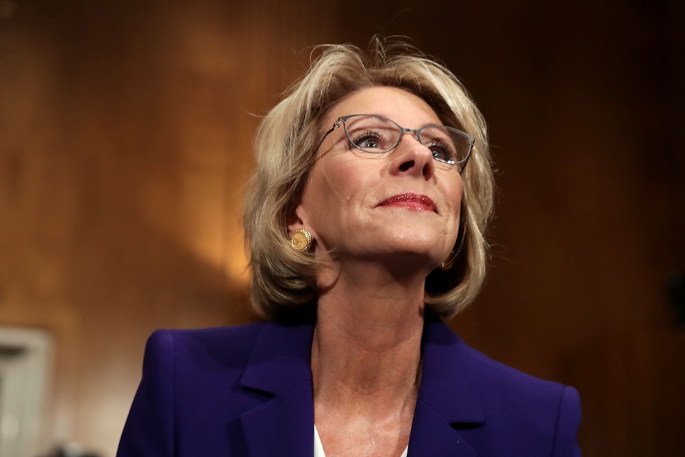 American Federation of Teachers president Randi Weingarten, who also spoke at the event, told The New Republic that sustained DeVos opposition would come to resemble conservative backlash to the Affordable Care Act in President Barack Obama’s first term. “I think what you’re going to see is a lot of grassroots action, just like with the Tea Party, over and over and over again,” she said. “The Tea Party started because they were convinced—even though it was untrue—that Obamacare was taking something away from them—their Medicare, their Medicaid, their Social Security. Here what’s happening is Betsy DeVos is really taking away something from them.”