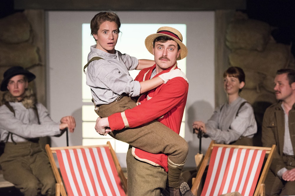 A cast of six (with standout performances from Phoebe Frances Brown and Ellen Francis) play all parts on a single set. They are dressed as soldiers, helmets and all. Saki welcomes the audience to the trenches, explaining how he joined up in his mid-forties despite being too old. All that is true. Then comes the fiction. Framed as stories told to liven up the deadening boredom of war, the six actors leap into a series of tales from Saki’s oeuvre. With only the most minor of costume changes and using minimal props, the cast dart in and out of identities and worlds fluidly and with total conviction.