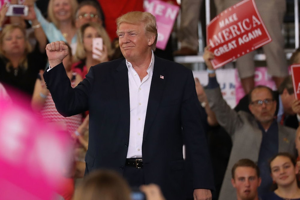 It was, in effect, a greatest hits rally. Like going to see Boston or .38 Special in 2017, Trump did tired versions of old favorites: He talked about the border wall (now, hilariously, the “great border wall”) and companies moving overseas and the terrible Democrats and how the federal government is getting screwed by private companies. At one point, resembling late-period Lenny Bruce, he read the travel ban executive order to the crowd to point out ... something. He brought out a rabid fan to say a few words, which was probably the silliest thing I’ve ever seen a president do. Melania kicked things off by reading the Lord’s Prayer. It was a weird rally, in other words, but only because Trump was president—in most ways, it seemed like the kind of rally Trump did over and over again in the long summer of 2016.