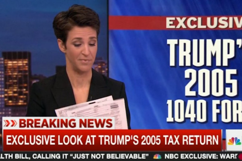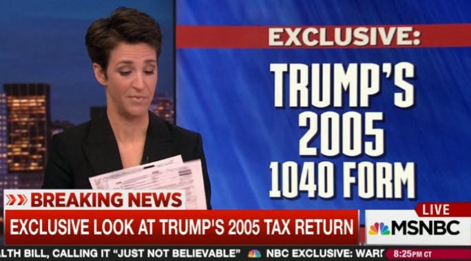 The show did itself no favors by being, well, a Rachel Maddow show. There was a long lead-in that was extremely speculative. (Could Donald Trump have been doing business with shady Russian mafia figures? Who knows!) Then we got the reveal: Trump in 2005 was still using the nearly $1 billion tax write-off that The New York Times brought to light last year, and paid a $36.3 million in income tax on $150 million in income. Of that $36.3 million only $5.3 million, a rate of less than 4 percent, was regular income tax—the rest was paid under the alternative minimum tax, which Trump has pledged to repeal.