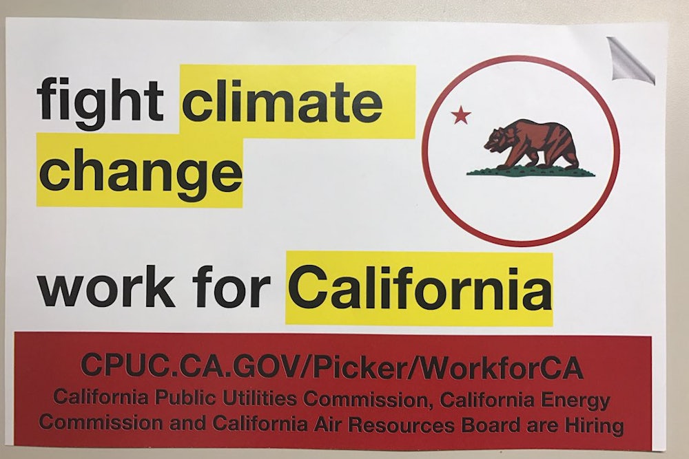 A current EPA employee who requested anonymity told me that officials with the California Public Utilities Commission this morning were standing atop a staircase at EPA headquarters in Washington, D.C., handing out flyers that read, “Fight climate change. Work for California.” At the bottom, the flyer says that the PUC, Air Resources Board, and Energy Commissions are hiring, and directs interested parties to a website with the job listings. A tweet from the state’s official PUC account today appears to confirm their presence.