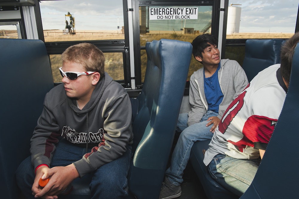 In September 2015, Andrew Cullen, a photographer based in Bismark, North Dakota, traveled to Alexander to document the team. “It was a sweet story about a small town that regained something it had lost,” he says. In the above photograph, freshman players Carlton Turnquist and Alejandro Constantino travel to a game in nearby Fairview, Montana. Turnquist was born and raised on a farm in Alexander; Constantino’s family moved there from California to cash in on the boom.