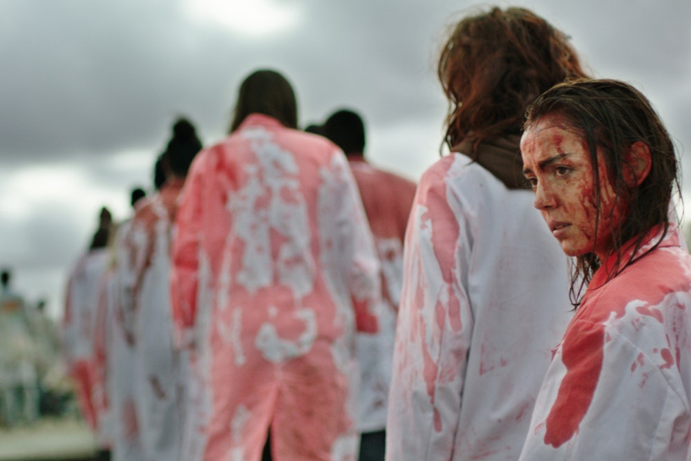 Justine’s older sister, Alexia, is also a student at the school. Instead of taking her side during the hazing, Alexia forces a bit of vet-school offal down Justine’s throat (remember, she’s a vegetarian). Justine retches; Alexia tells her to just do it, everybody is watching. We’re already deep into dreamlike shots of stained labcoats and horses running on treadmills when Justine starts to itch.