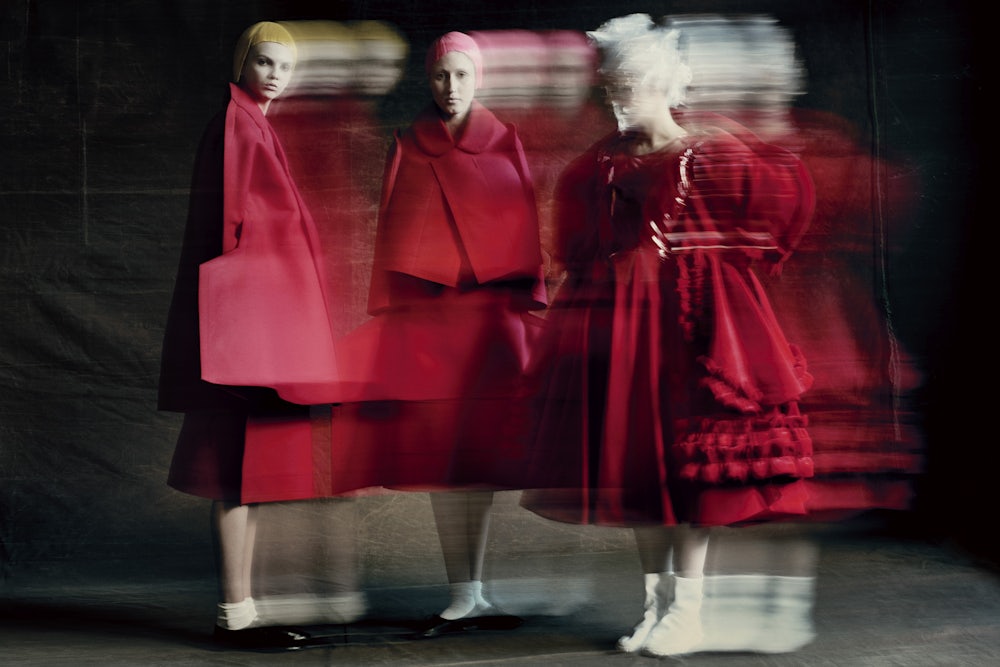 On the red dresses, Kawakubo’s signature “bulges” look sexy. When done in white padding, they are tumor-like, medicalized; in other instances they suggest the softness of a sofa. Some you want to touch, some to care for. Her interventions undo the most basic—or classical—ideas of “shape” in fashion design, relocating the curve of the body in the garment itself, redefining the relationship between the two.