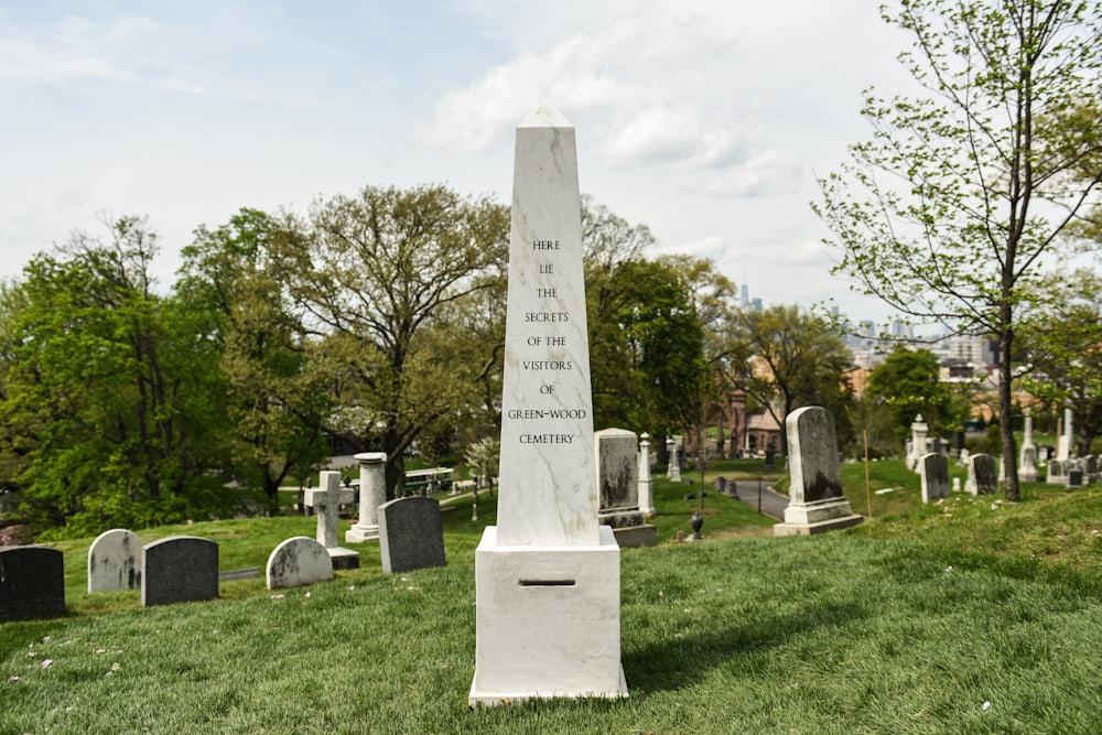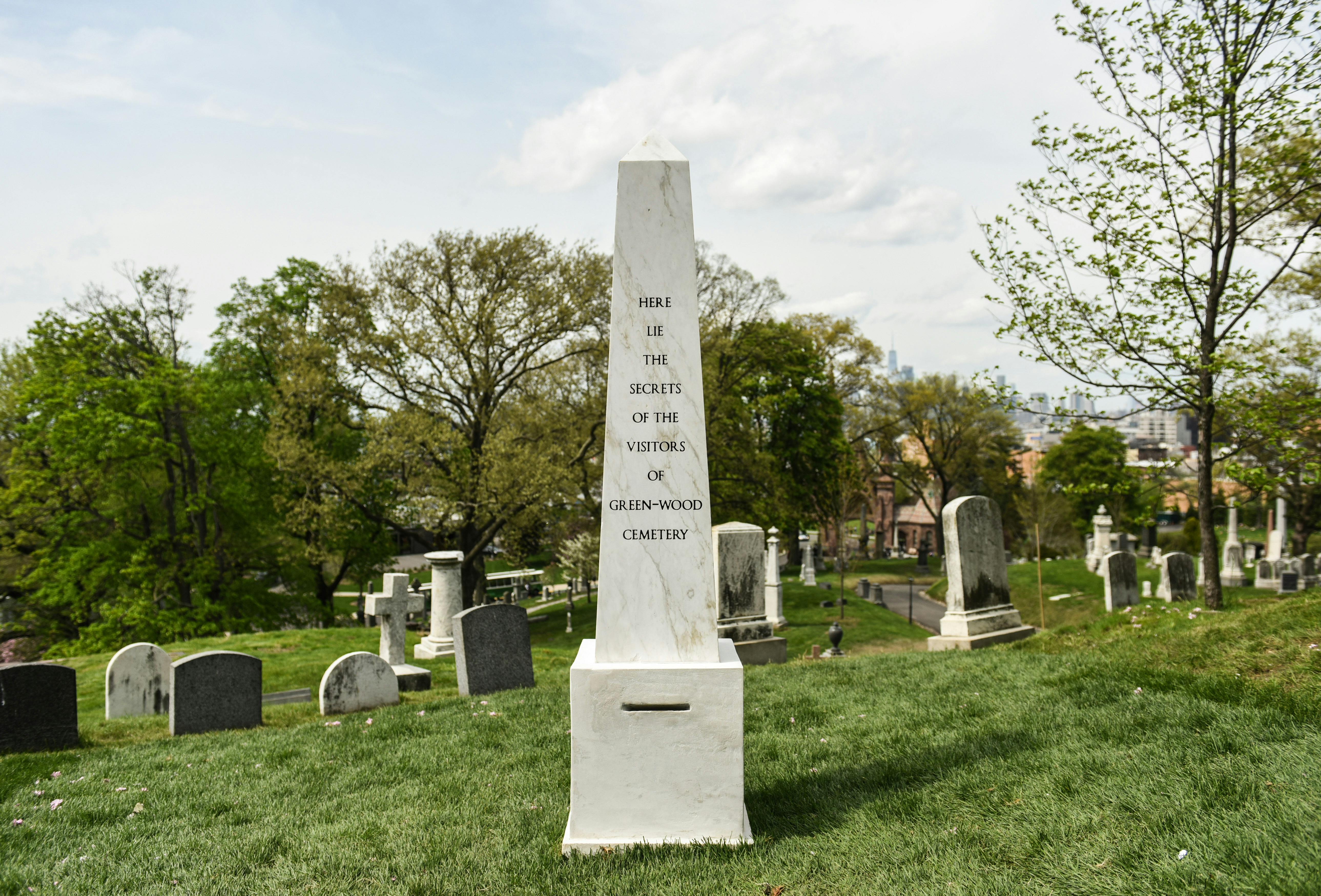 The project is called Here Lie the Secrets of the Visitors of Green-Wood Cemetery: 2017 – 2042. You tell Sophie Calle a secret, she writes it down, then you pop it through a little slot in an obelisk and there your secret stays. I’ll be 54 when it ends. Calle herself will be 89. In a leaflet distributed to visitors, Calle explains that a “cemetery plot has been granted to me ‘in perpetuity,’ which means the project will continue for 25 years.”