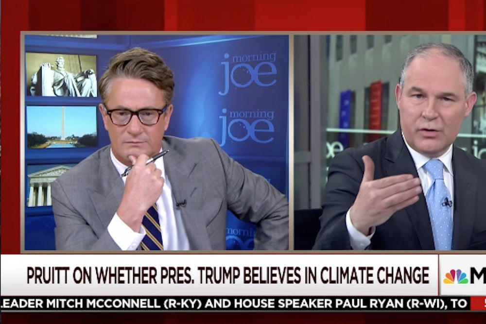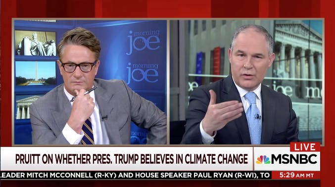President Donald Trump’s ultra-conservative EPA chief spent a good 15 minutes on Tuesday morning getting grilled by MSNBC panelists about Trump’s recent decision to pull the U.S. out of the Paris climate accord. It was not a smooth interview. At one point, host Joe Scarborough had to pause it because Pruitt repeatedly refused to answer a basic yes-or-no question on climate change. Still, Pruitt’s interview did reveal the Trump administration’s warped view of environmental policy. They want Americans to believe that: