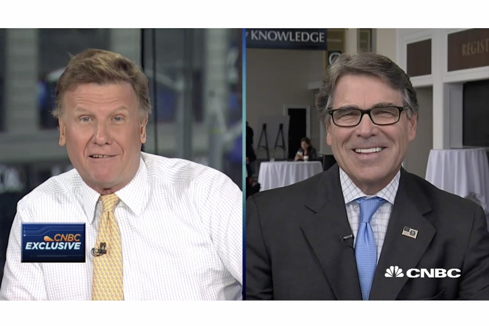 But that’s exactly why officials like Pruitt and Perry appear on Squawk Box in the first place. Whereas many cable news hosts would never let them get away with the nonsense claim that carbon dioxide has nothing to do with global warming—Fox News’ Chris Wallace grilled Pruitt on this very subject in April—they know that such ignorant, dangerous views will go unchallenged by Kernen. Squawk Box is their safe space, and Kernen is their megaphone.