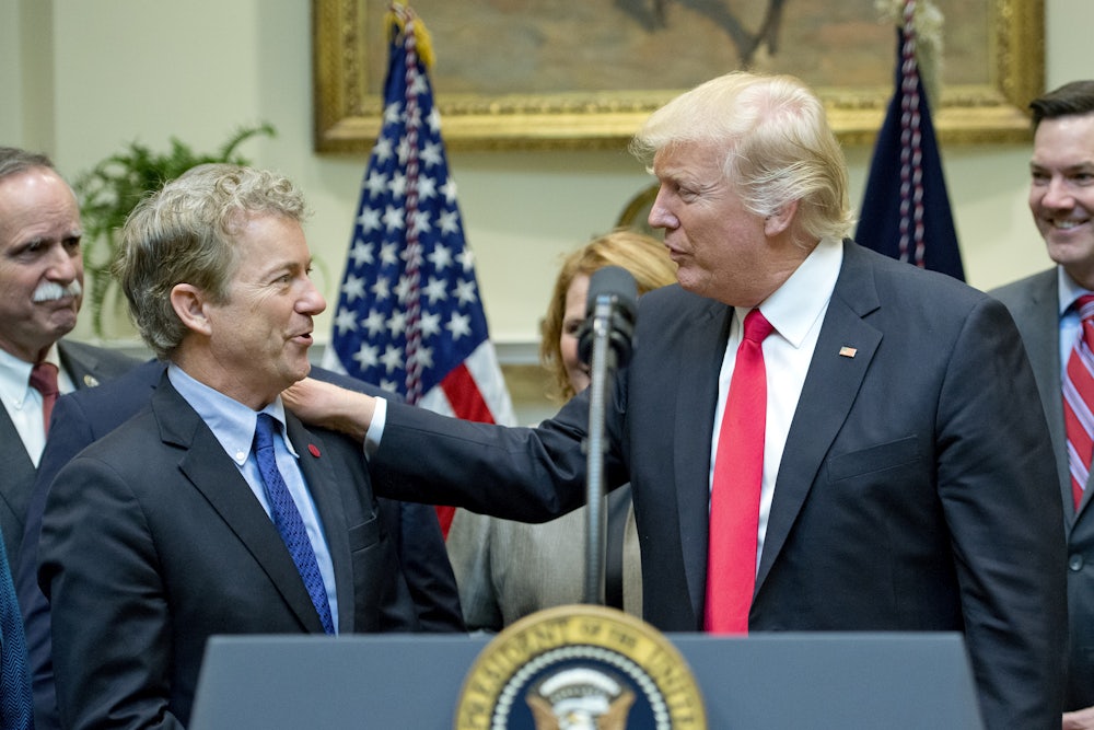 This repeal-and-delay strategy was so politically toxic that it became a dead letter before Donald Trump took the oath of office. Among the people who opposed the plan were Senator Rand Paul and, reportedly, Trump himself. “I think it’s imperative that Republicans do a replacement simultaneous to repeal,” Paul told MSNBC’s Morning Joe way back on January 4. This line of argument was persuasive to Trump, according to Paul. “He called after seeing an interview that I had done [talking about] that we should vote on Obamacare replacement at the same time,” Paul said. “He said he was in complete agreement with that.”